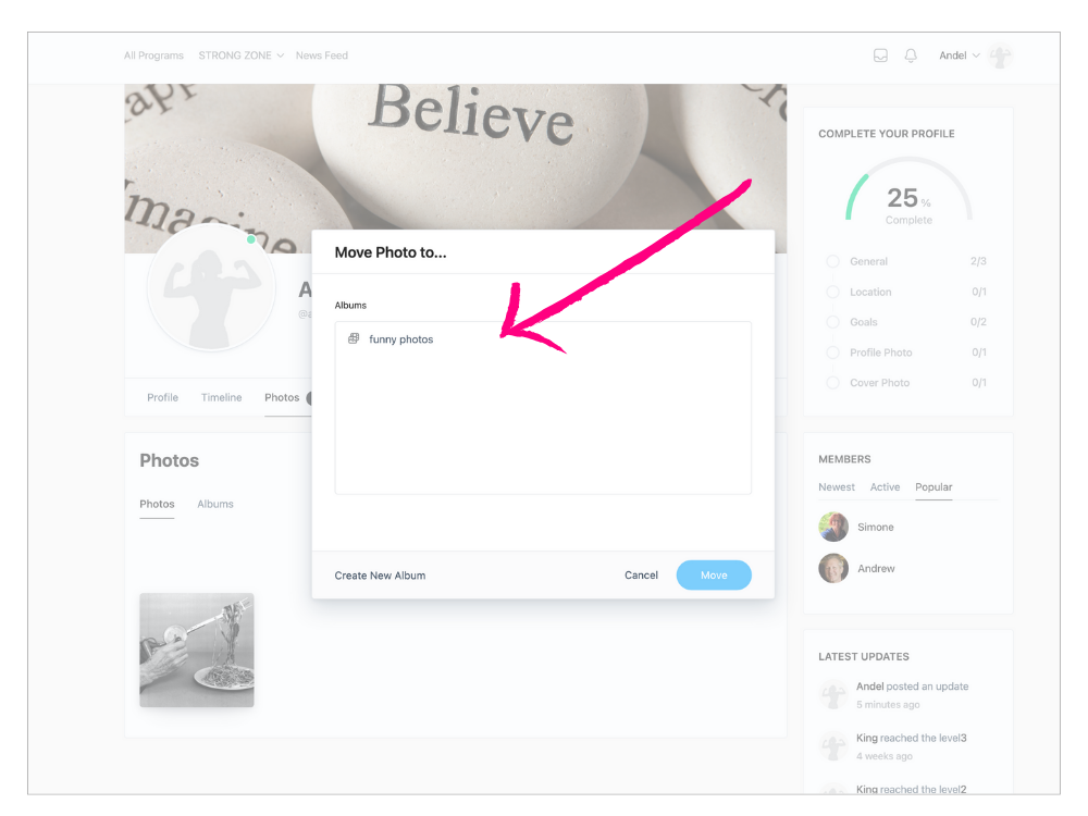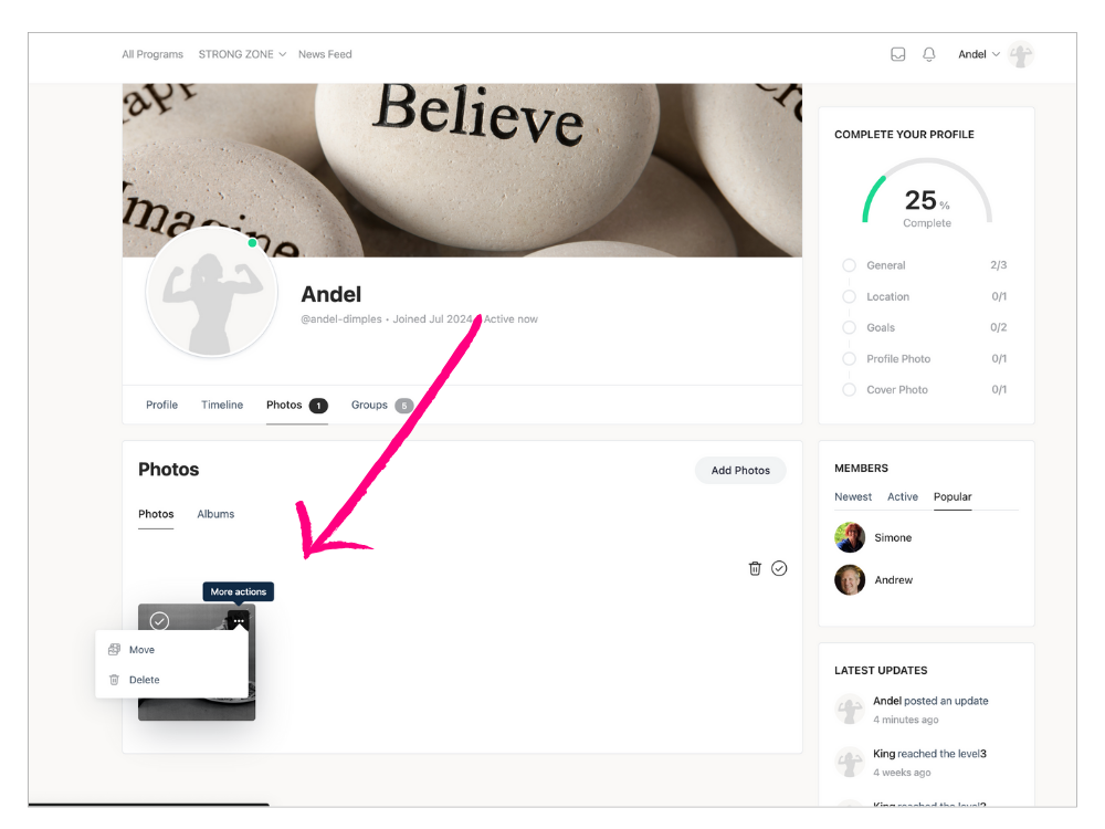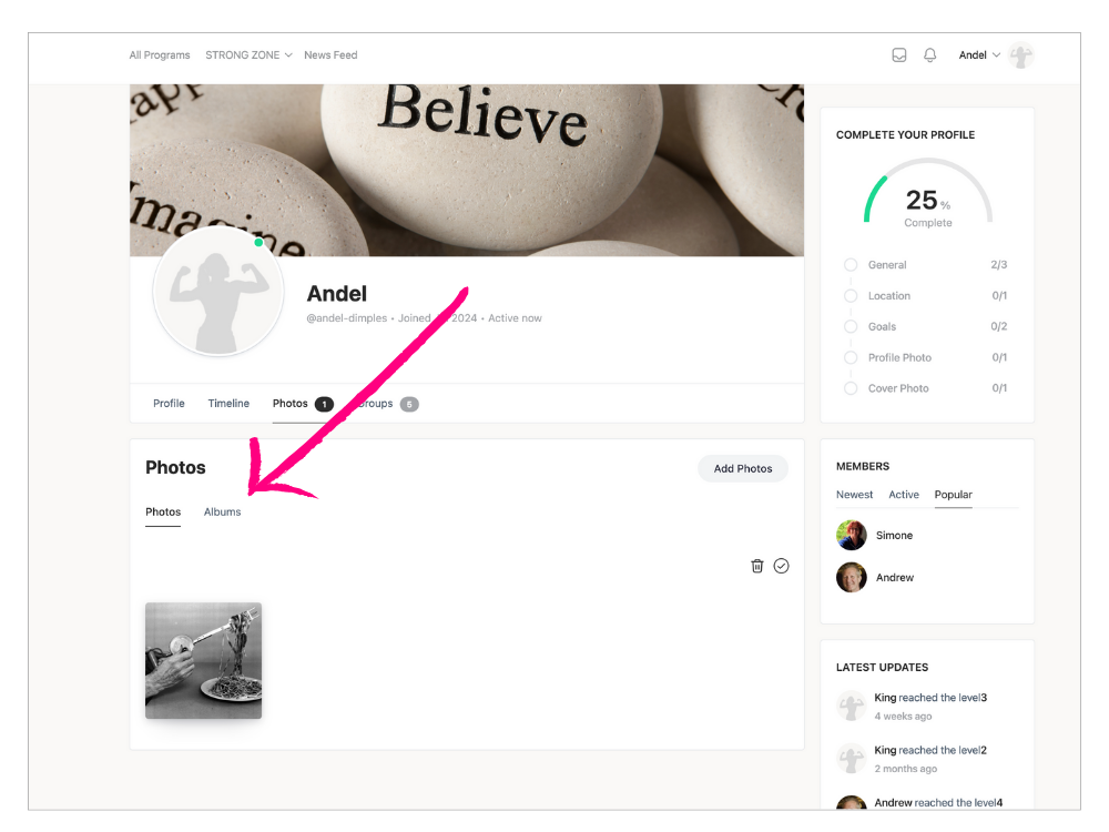 To access your photos click your name or photo in the top right and from the dropdown menu select ‘photos’. From here you can upload any photos that represent your fitness and wellness journey.