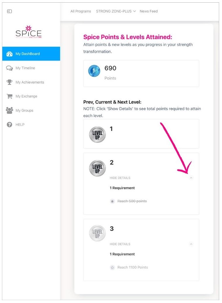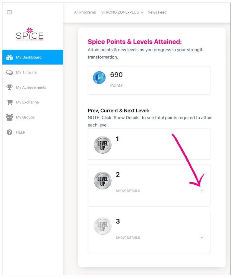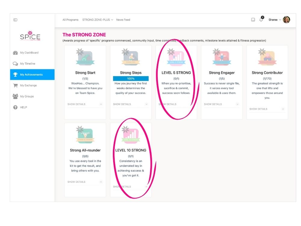 Levels are the achievement result of consistent step-by-step actions in using ALL the tools, challenges, programs, groups etc within the SpiceSTRONG Online site to progress and empower your Strength Transformation.