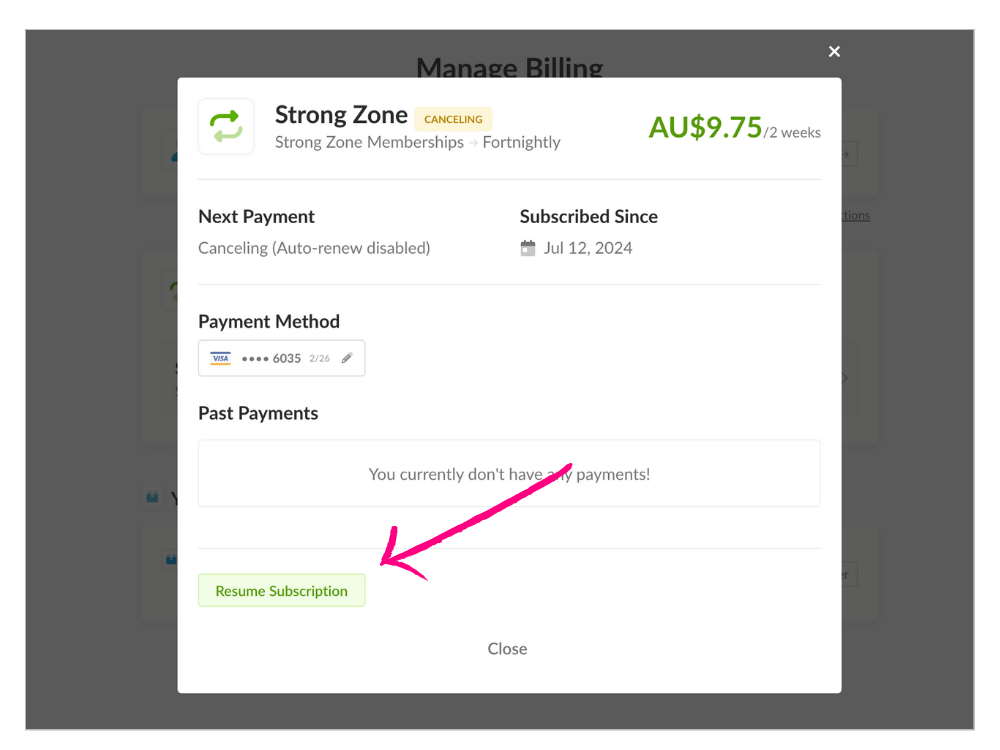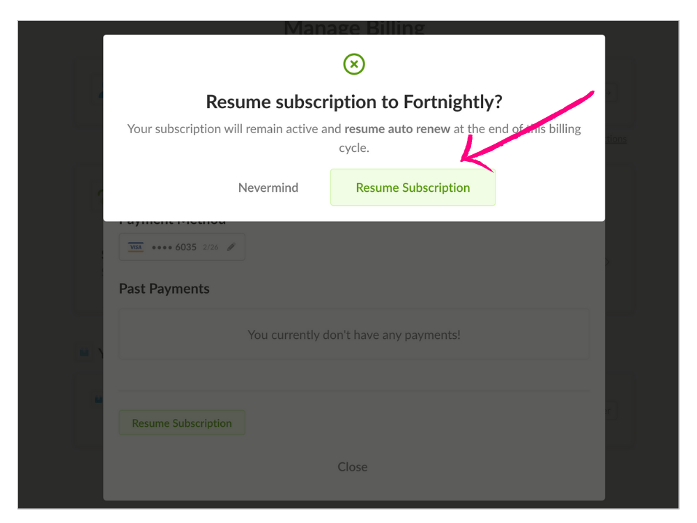 - Select the RESUME SUBSCRIPTION button.