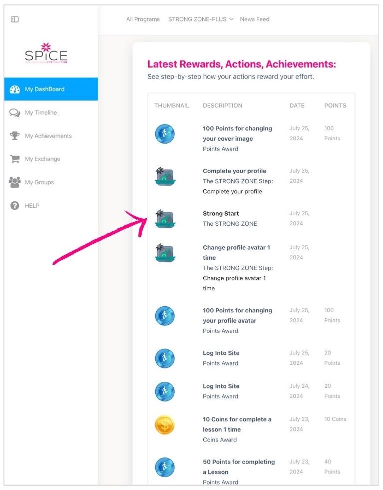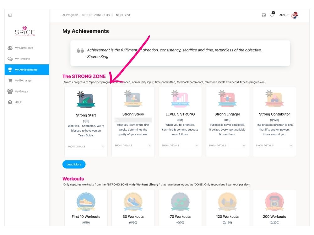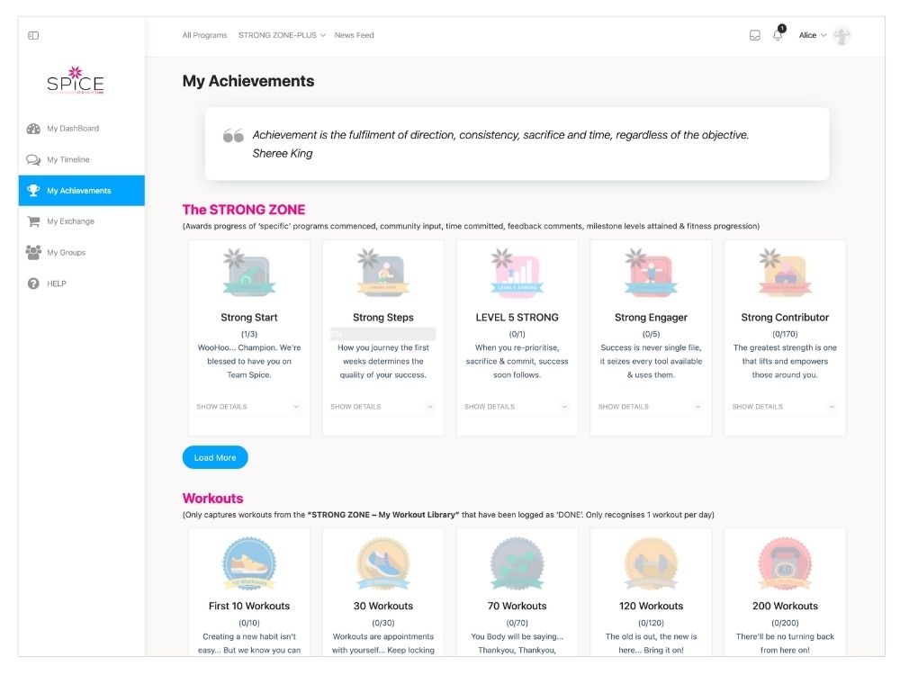 Achievements result from consistent step-by-step actions in using ALL the tools, challenges, programs, groups etc within the SpiceSTRONG Online site to progress and empower your Strength Transformation.