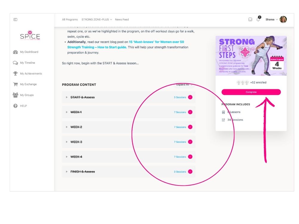 - When you’ve finished ALL the sessions and weeks and have CLICKED all the complete buttons, you’ll see at the program level view that