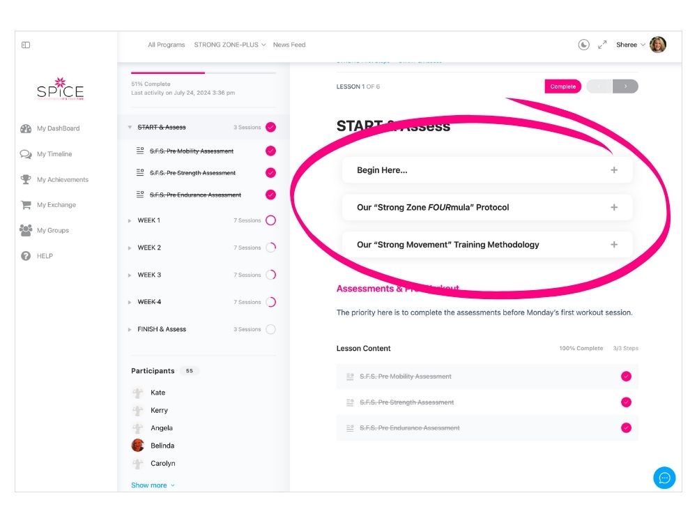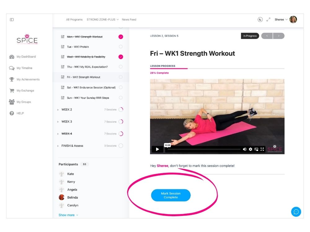 - When ALL the weeks sessions have been completed, CLICK the “Mark Session Complete” button ant the bottom of the page.