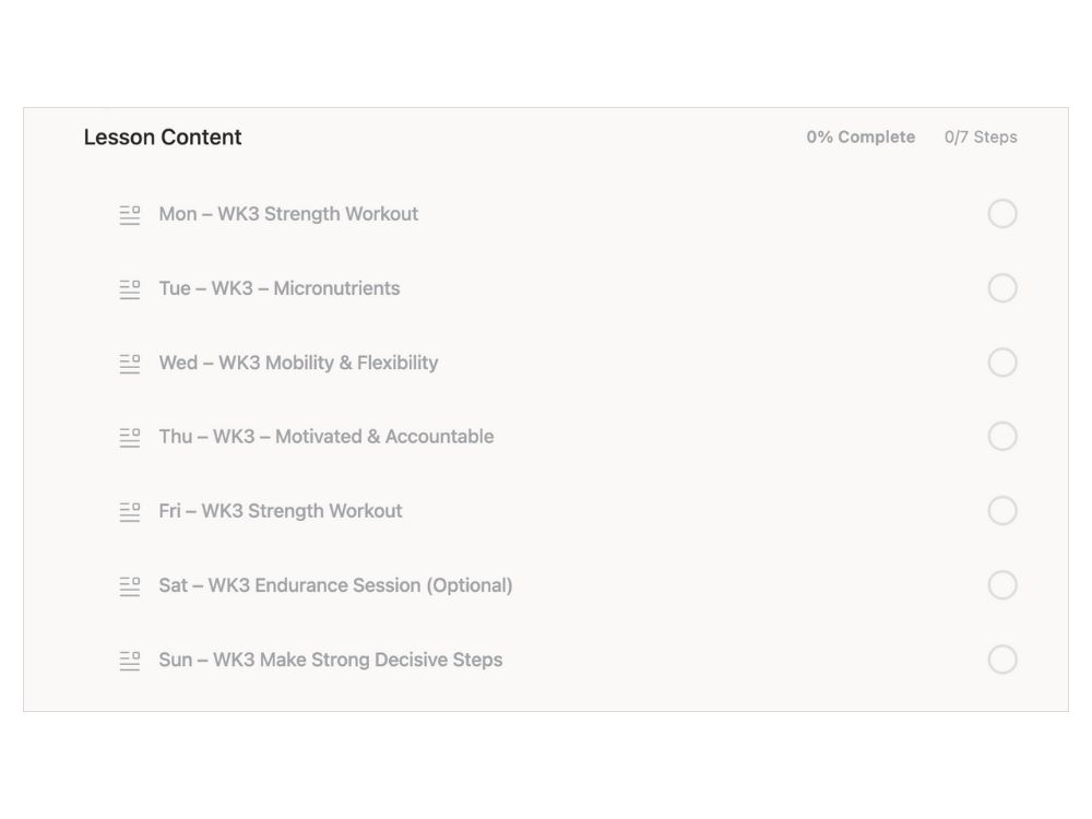 OUR RECOMMENDATION is that, at the very least, you commence the programs week ONE on a Monday. - From week 1 through week 4 in all aspects of the program (ie. Move, Nourish, Believe, Restore) there is progression, So, at the end of the program you’ll not only feel your body is stronger, but ALL the other aspects of the Strong Zone will be improved.
