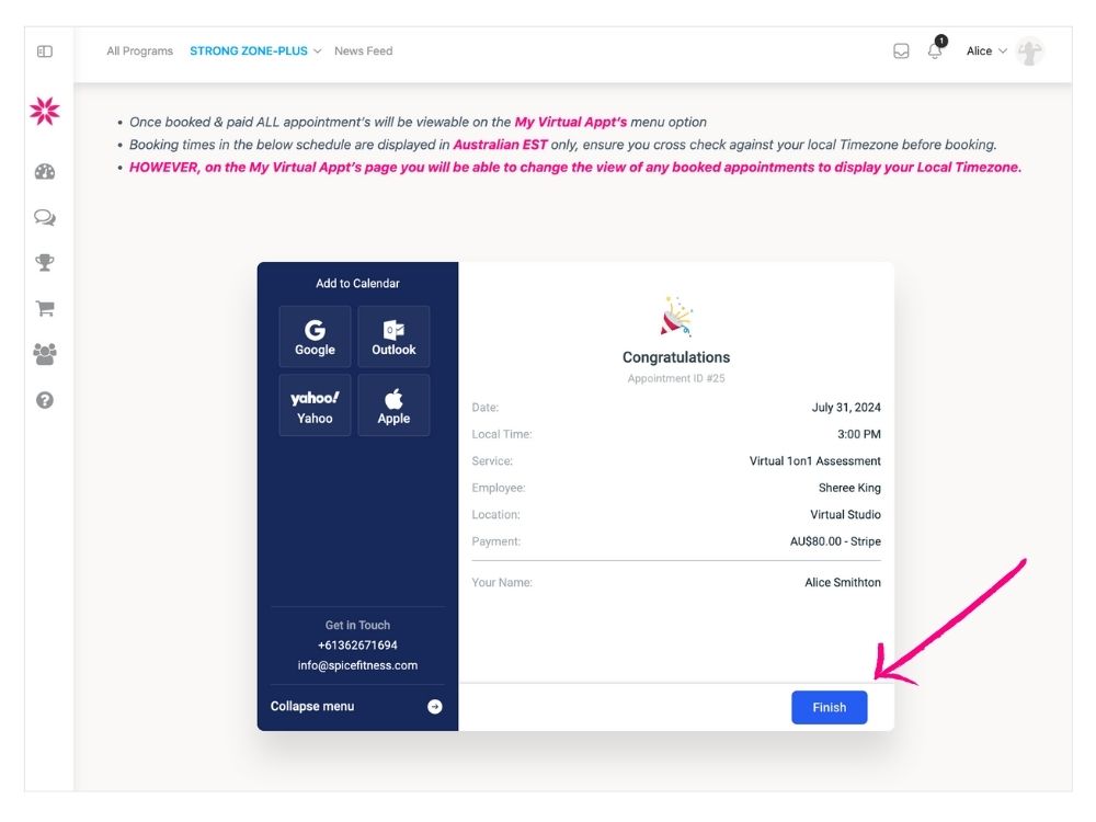 - Your booking appointment day/time can now be viewed on your DASHBOARD