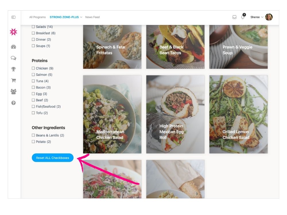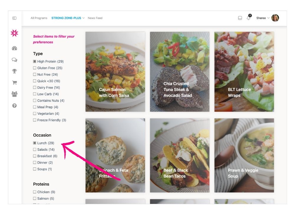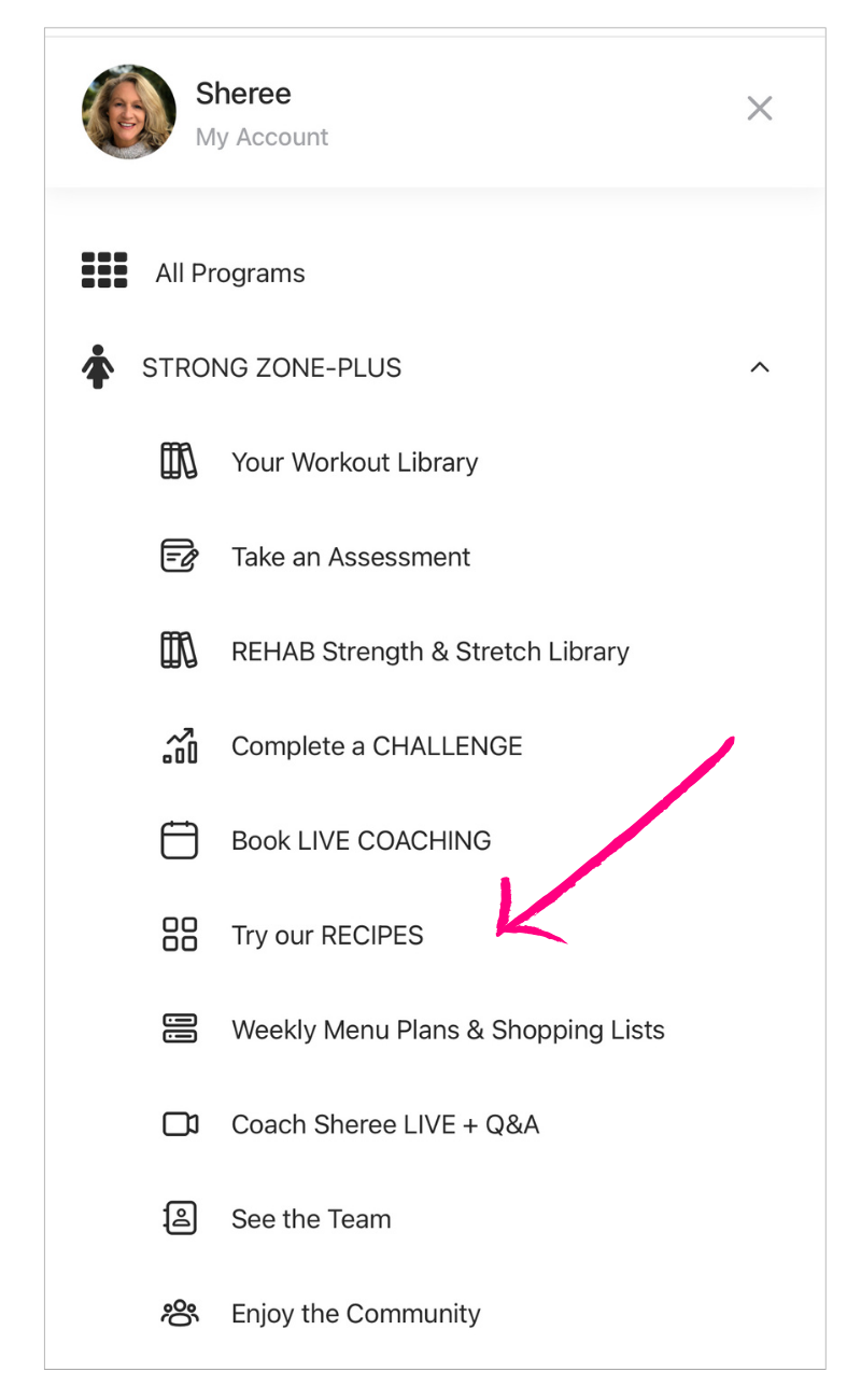 Access the recipe library from within the STRONG ZONE menu option in the header page navigation for computer,