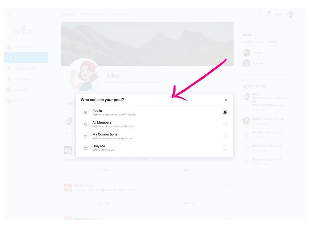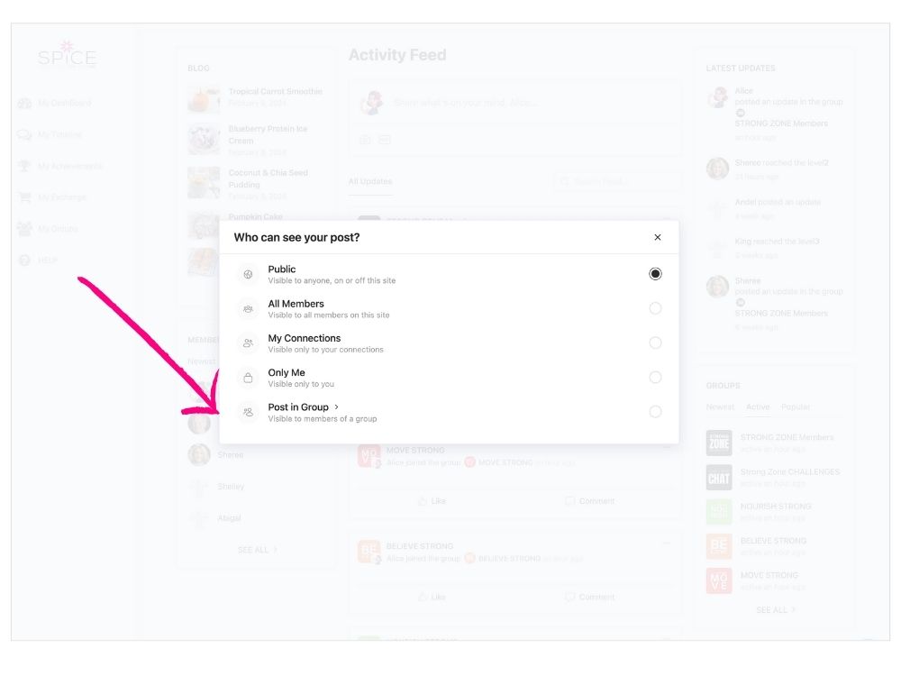 - By clicking the PUBLIC dropdown box next to the profile opens up options on who can see the post.
