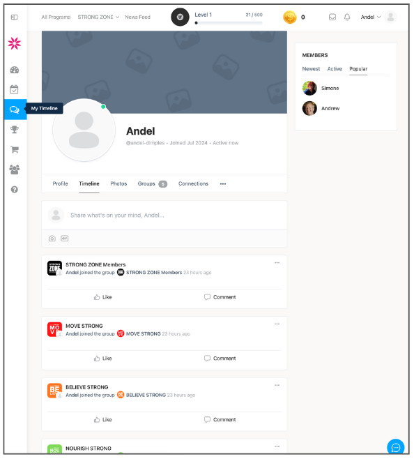 As you progress through the strong zone posting comments and commenting in the group chats. Along with achieving the various milestone achievements along the way, the ‘My Timeline’ keeps track of these, thereby becoming an easy reflection point on how well you’ve been going and engaging.