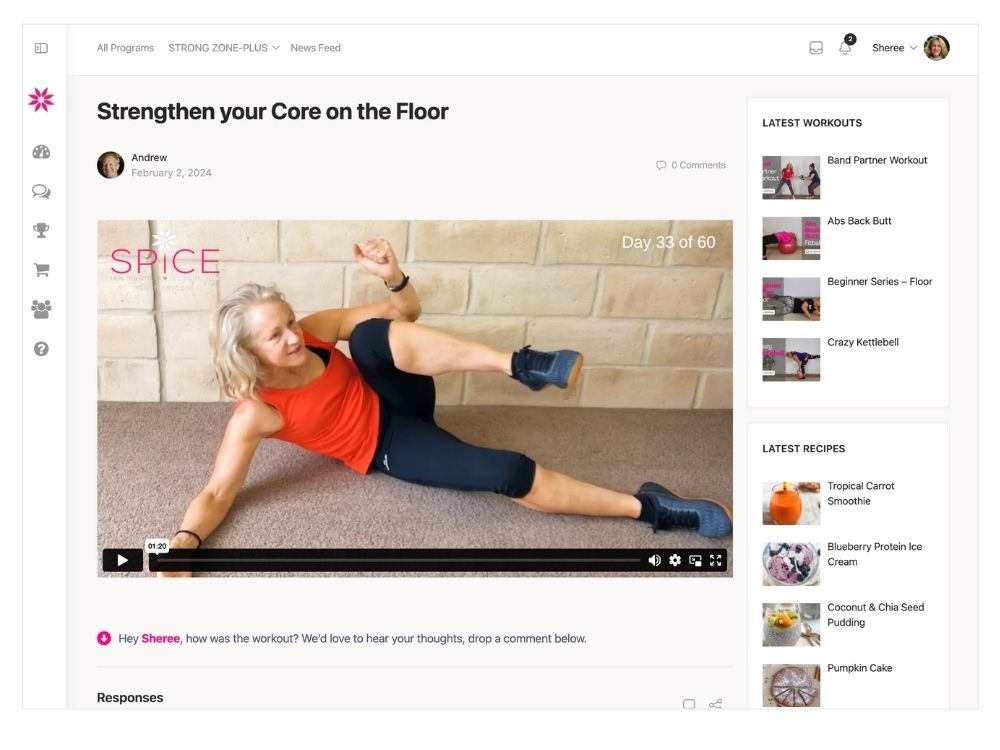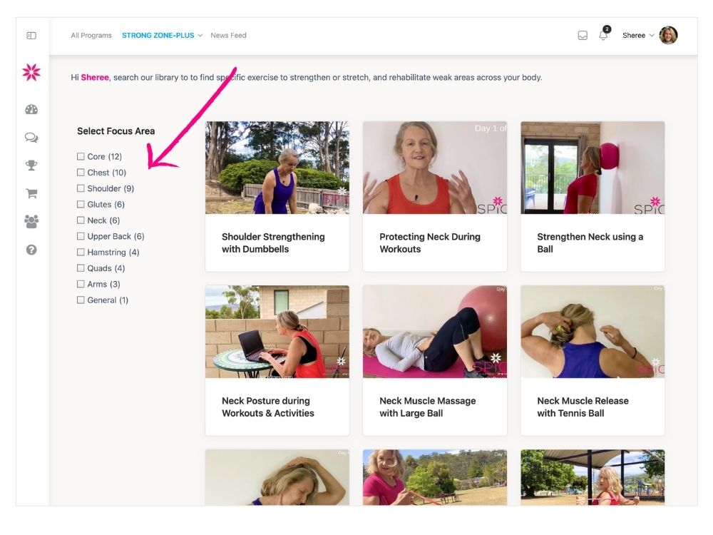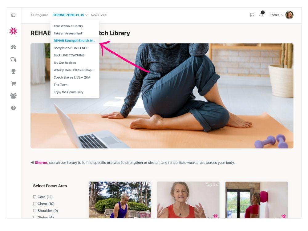 Access the REHAB library from within the STRONG ZONE menu option in the header page navigation for computer,