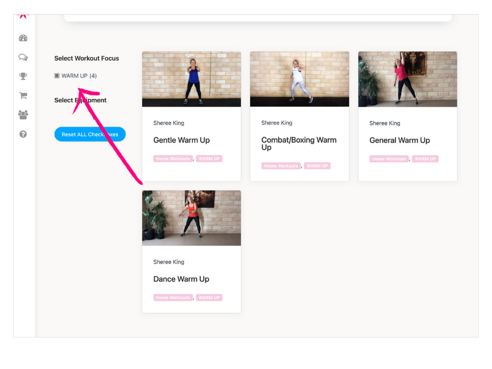 To access the warmups, from the workout library filter options, check the WARM UPS option, then select warm up option.